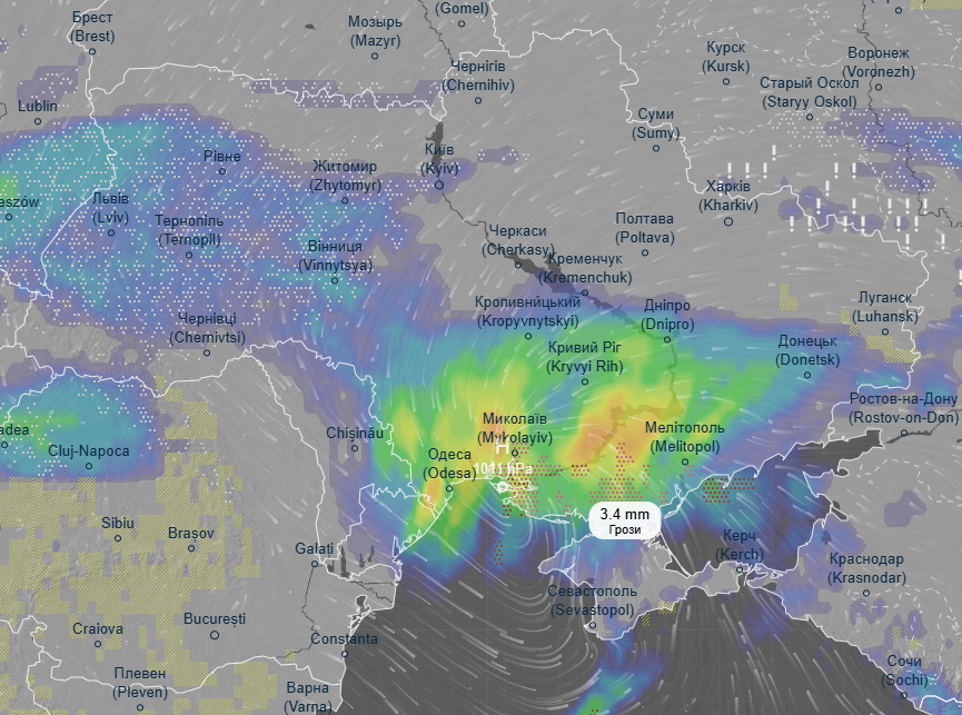 До конца суток 10 декабря атмосферный фронт переместится на юг - вечером в Николаевской, Одесской, Херсонской областях и на Запорожье ожидаются сильные ливни с грозами. Небольшой снег будет пролетать в западных областях и в центре.