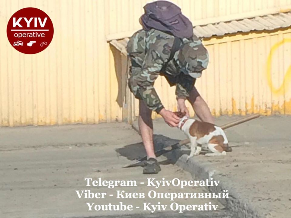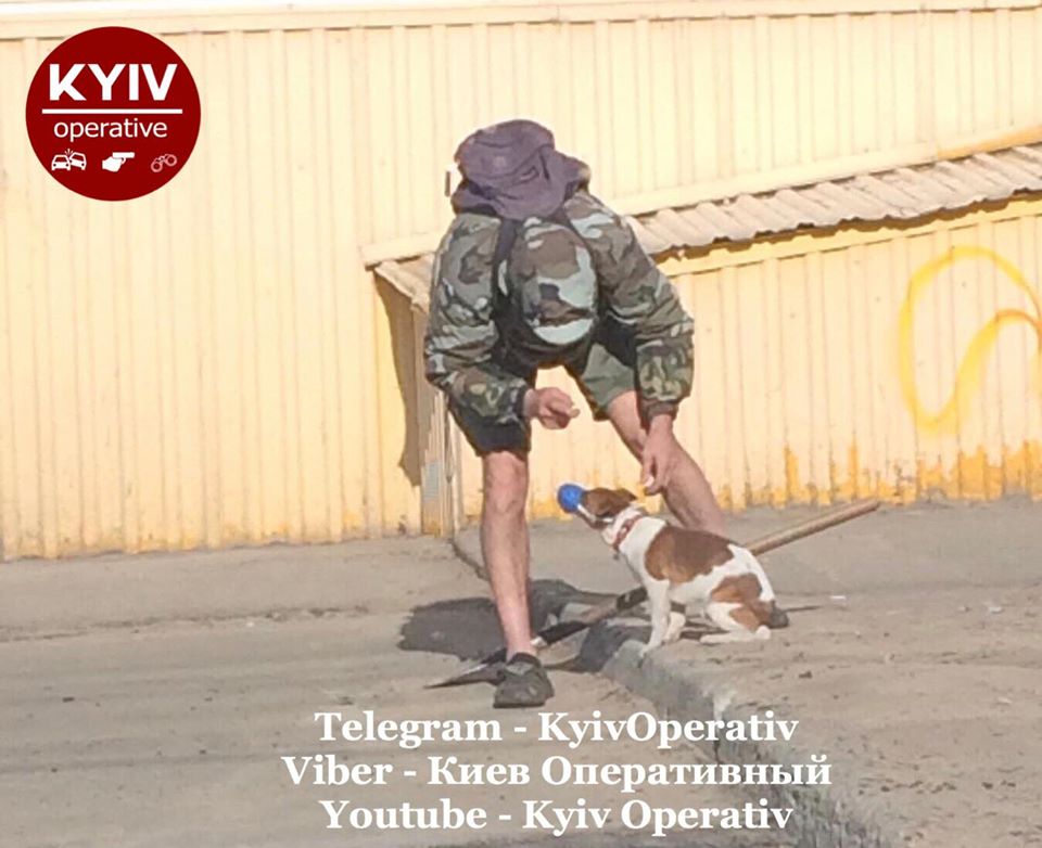 В Киеве мужчина в период карантина выгуливал собаку, на которой была медицинская маска.