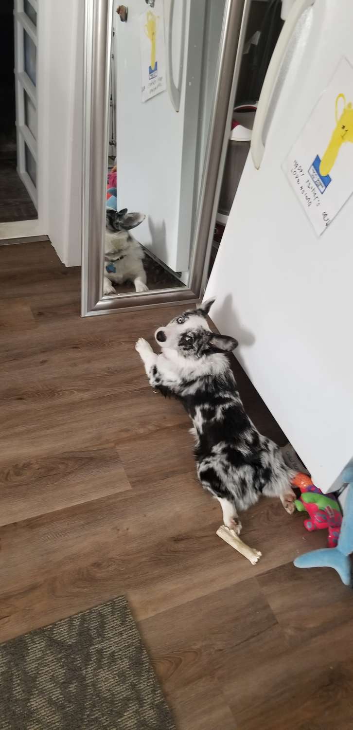 Хозяйка пыталась объяснить собаке, что в зеркале - она же. Но Фрейя так до сих пор этого не поняла, поэтому каждый раз, проходя мимо, пугается и гавкает на зеркало.