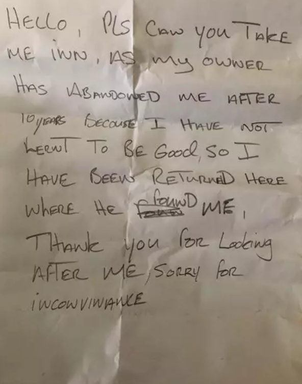 "Пожалуйста, примите меня, так как мой хозяин бросил меня через 10 лет, потому что я не научился быть хорошим, поэтому меня вернули сюда, где он нашел меня", - говорилось в записке.