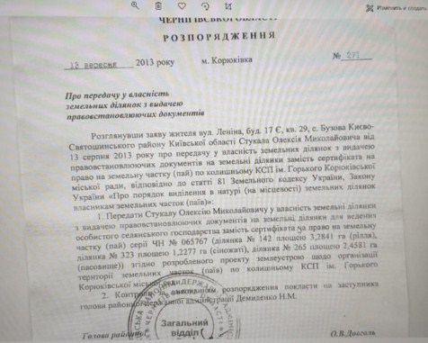 Имея в собственности массив земли в Черниговской области, квартиру и участок в с. Бузовая, Стукало требовал в Бузовском сельсовете бесплатной передачи ему в собственность еще 15 соток земли из коммунальной собственности. В концентрацию земли в Бузовой, вероятно, должен был войти и участок Елены Кравчук, однако Стукало решил отказаться от сделки.