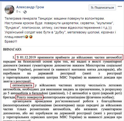Он опубликовал часть телеграммы украинского генерала, где говорится, что на подразделение допускается лишь 5 единиц авто, а другой транспорт – необходимо вернуть волонтерам.