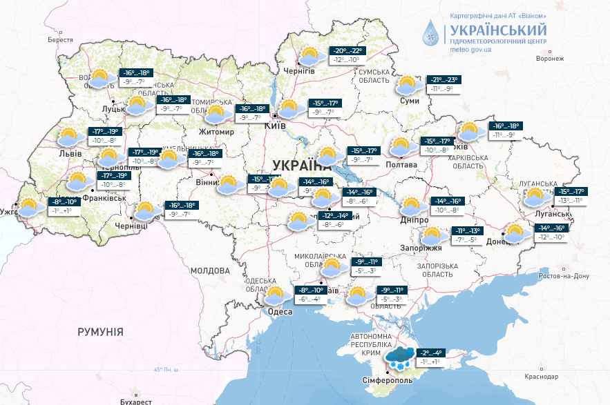 "Температура ночью 15-20° мороза, на Черниговщине и Сумщине до 25°, днем 7-12°; в южных областях и на Закарпатье ночью 8-13° мороза, в Крыму 1-6° мороза, днем 2-7° мороза , на Закарпатье и в Крыму около 0°", - говорится в сообщении.