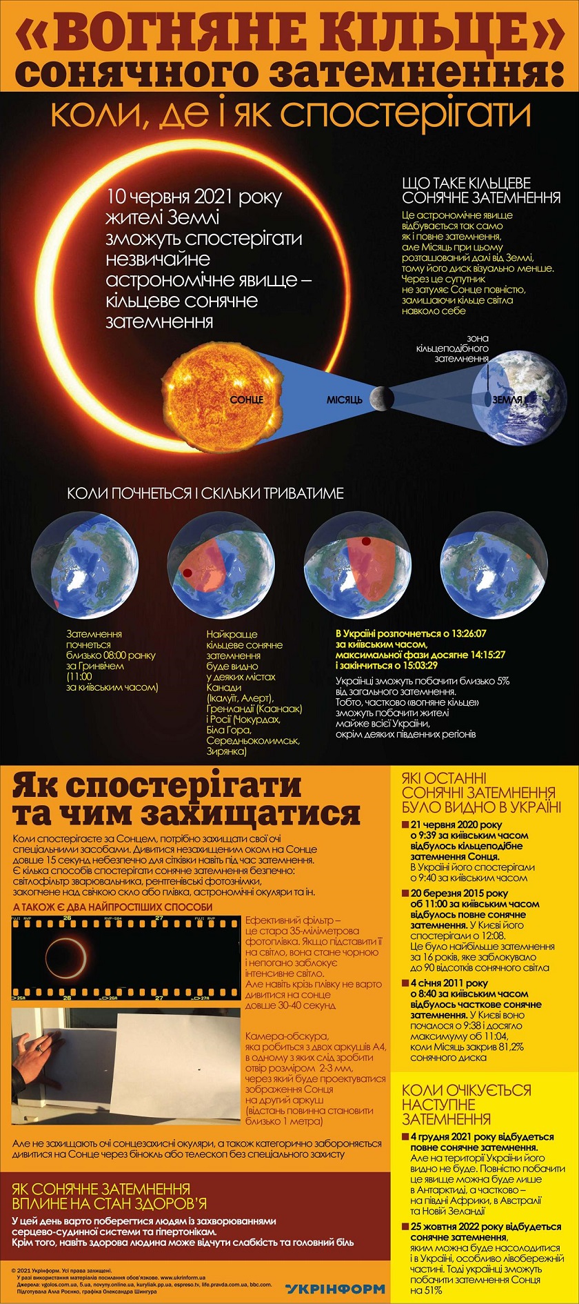 В четверг, 10 июня, жители почти всех регионов Украины смогут наблюдать впечатляющее и редкостное астрономическое явление - кольцеобразное солнечное затмение, когда Луна закроет Солнце, оставив вокруг себя "огненное кольцо".