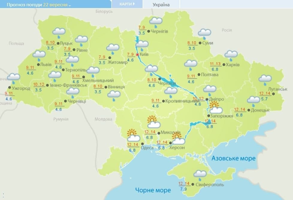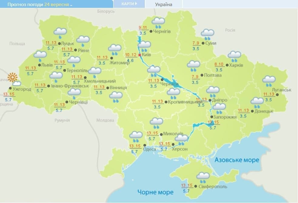 В пятницу, 24 сентября, холоднее всего будет на севере и северо-востоке Украины – днем термометры покажут +7-11 градусов, ночью +3-5. Самым теплым местом традиционно станут морские побережья и Закарпатье. Дневные температуры там составят +13-15 градусов, ночью +5-7. На остальной территории ожидается +10-13 днем и +3-7 ночью. Осадки при этом усилятся.