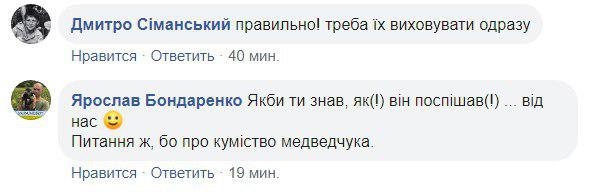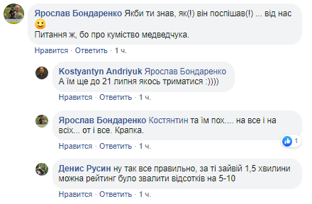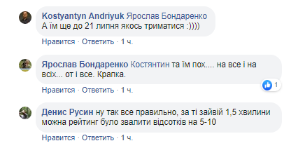 "Если бы ты знал, как (!) Он спешил (!) ... от нас :) Вопрос же, о кумовстве Медведчука", "А им еще до 21 июля как-то держаться", "та им пох .... на все и на всех ... вот и все. Точка", "в так все правильно, за те лишние 1,5 минуты можно рейтинг было свалить процентов на 5-10", "Да просто уважение к законам и правилам должно быть в голове. И тогда это автоматом будет выполняться", - пишут комментаторы.