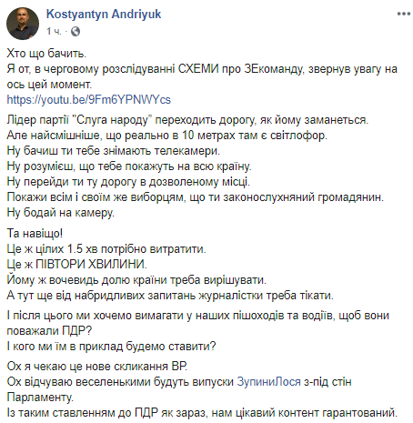 "Кто что видит. Я вот, в очередном расследовании СХЕМЫ о ЗЕкоманде, обратил внимание на вот этот момент. Лидер партии "Слуга народа" переходит дорогу, как ему заблагорассудится. Но самое смешное, что реально в