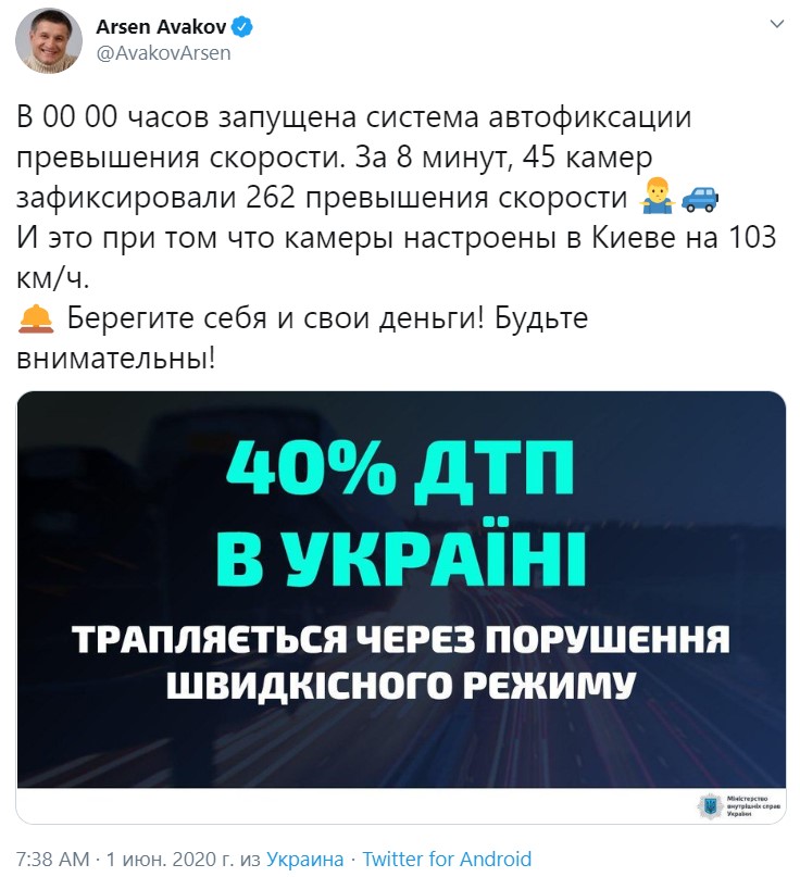 "В 00 00 часов запущена система автофиксации превышения скорости. За 8 минут 45 камер зафиксировали 262 превышения скорости. И это при том, что камеры настроены в Киеве на 103 км/ч. Берегите себя и свои деньги! Будьте внимательны!", - написал министр в своем микроблоге в Twitter.