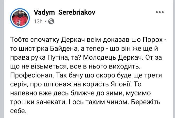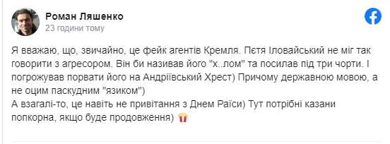 "Петя Иловайский не мог так говорить с агрессором. Он бы посылал его к черту. И угрожал порвать его на Андреевский Крест. Причем на государственном языке, а не этим паршивым "языком", - иронизирует пользователь Роман Ляшенко.