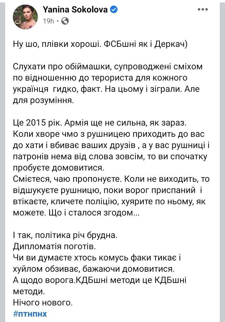 "Он говорил как президент, который хочет сохранить отношения с агрессором, который топчет твою землю и убивает твоих сограждан, - возмущается журналист. - Слабая политика всегда будет получать пренебрежение России. Они понимают только тогда, когда их убивают больше, чем могут убить они" .