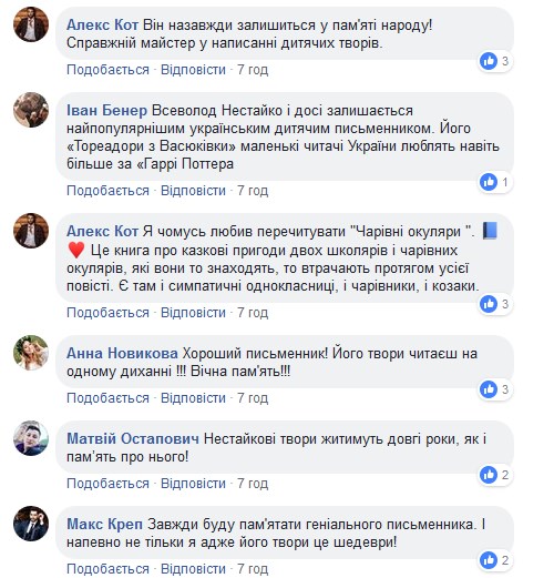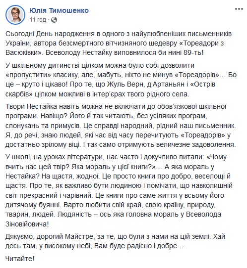 "Сегодня День рождения у одного из самых любимых писателей Украины, автора бессмертного отечественного шедевра "Тореадоры из Васюковки". Всеволоду Нестайко исполнилось бы сегодня 89!" - написала она.