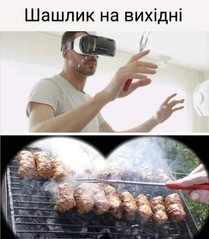 На фотожабе изображен "современный" способ приготовления праздничных шашлыков – при помощи технологий виртуальной реальности. На картинке изображен мужчин в VR-очках, которому авторы фотожабы "вставили" в руки вилку.