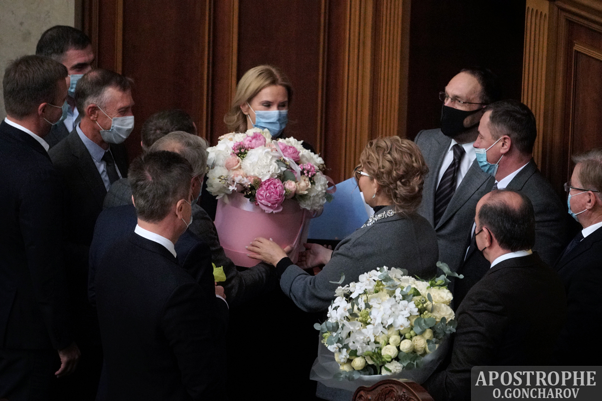 На фото видно, что нардепы дарят Кондратюк шикарные букеты и, судя по ее улыбке, говорят, что-то приятное. Примечательно, что все, кто ее поздравляет, в масках и надеты они правильно. Дистанцию в этом случае нардепы не соблюдают, но и слишком близко не подходят к имениннице.