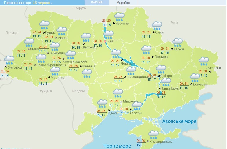 В понедельник, 15 июня, в Украине обещают дождливую погоду.