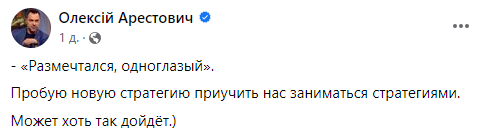Стоит отметить, что фото с "наклейкой" на глазу Алексей Арестович опубликовал в своей соцсети, в шутку назвав себя "одноглазым".