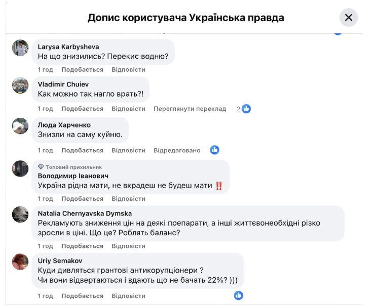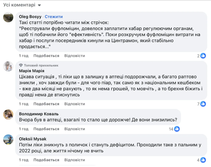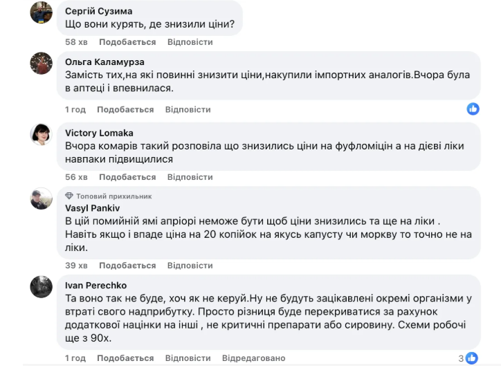Несмотря на заявления представительницы фармгиганта, украинцы активно выражают возмущение и заявляют, что не почувствовали никакого снижения стоимости лекарства, а заметили тенденцию исчезновения отдельных препаратов. В комментариях под интервью Загорий люди пишут, что цены на действительно необходимые препараты, наоборот, выросли, а удешевление коснулось преимущественно сомнительных лекарств без доказанной эффективности.