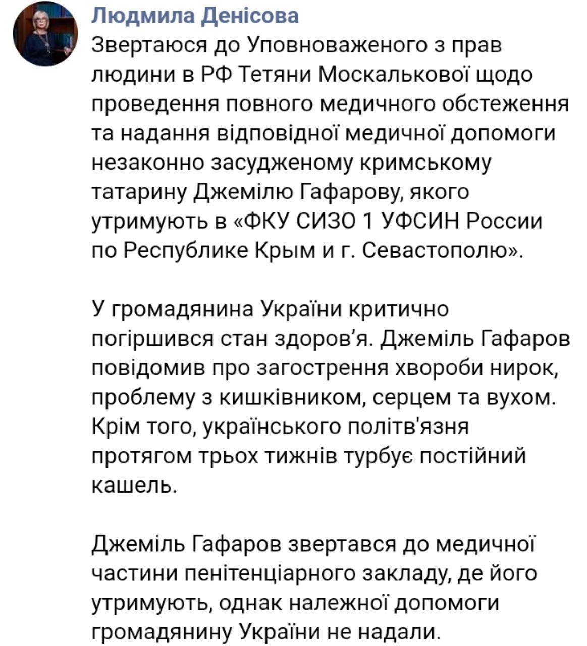 "У гражданина Украины критически ухудшилось состояние здоровья. Джемиль Гафаров сообщил об обострении болезни почек, проблемах с кишечником, сердцем и ухом. Кроме того, украинского политзаключенного в течение трех недель беспокоит постоянный кашель. Джемиль Гафаров обращался в медицинскую часть пенитенциарного заведения, где он содержится, однако должной помощи гражданину Украины не предоставили ", - написала Денисова.