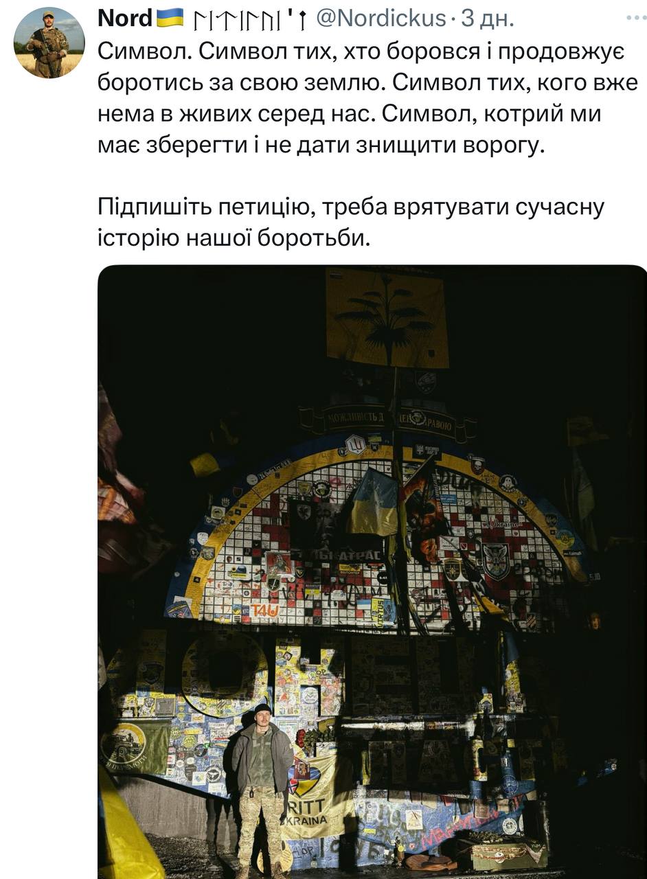 В петиции отмечается, что на этом потолке военнослужащие, волонтеры и жители оставляли свои надписи – имена, даты, обращения и символы. Она стала неформальным памятным местом, отражающим события полномасштабной войны и сохраняющими историю как живых, так и павших защитников и защитниц Украины.