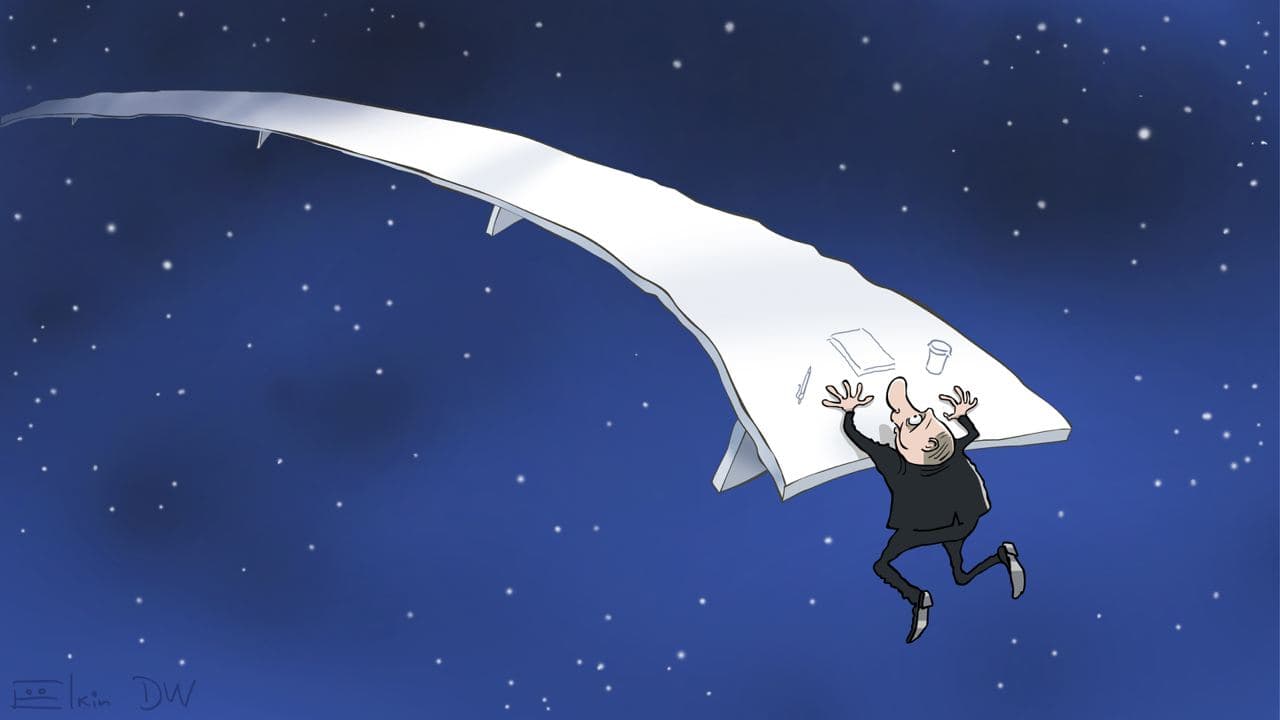 На карикатуре нарисован человек, похожий на президента России, который пребывает в космосе в невесомости и еле-еле держится за огромный стол, конца которого на картинке не видно.