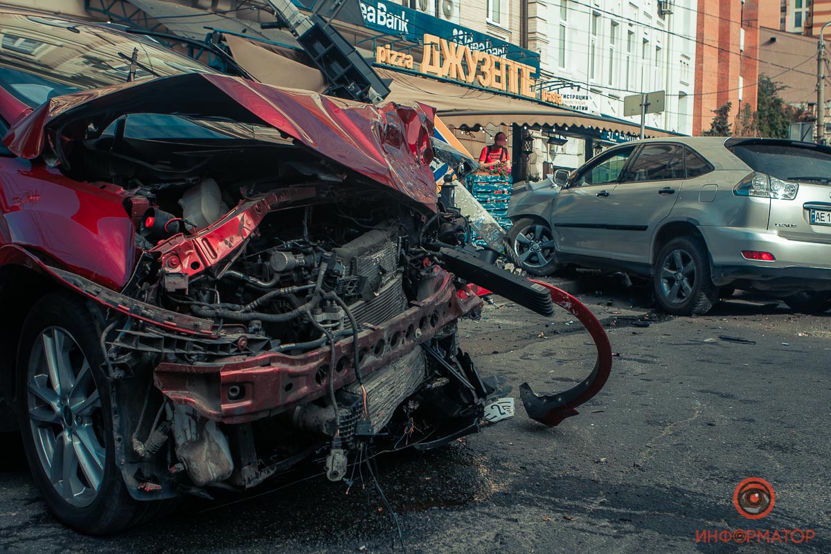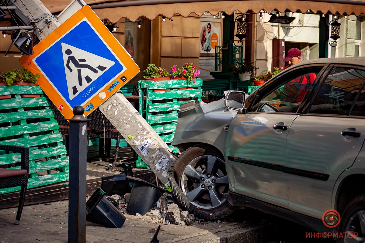 Во время столкновения одно авто влетело в столб и он упал. Конструкция смяла забор летнего кафе, раздавила навес заведения и чуть не разбила окно. Второй автомобиль задел припаркованный рядом еще один Ford.