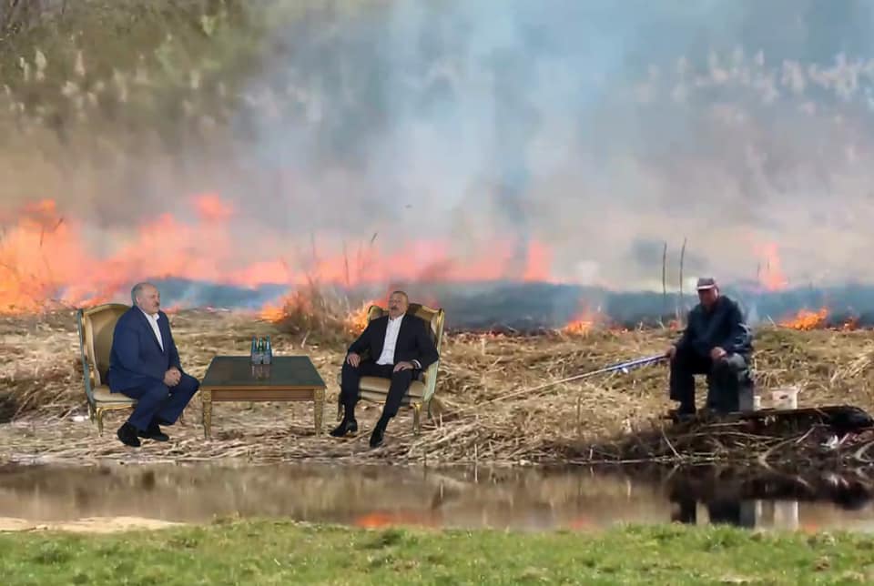 На фотожабе Лукашенко якобы сидит возле водоема на рыбалке. А в это время за его спиной горит трава.