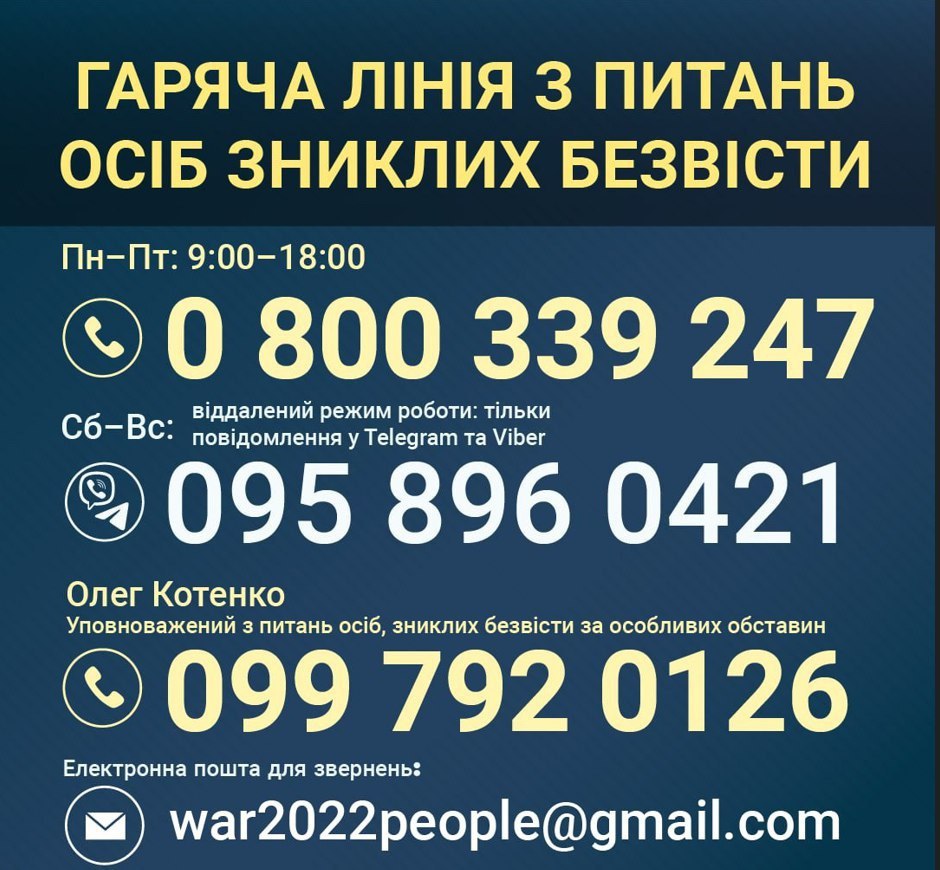 Жители Изюма, у которых пропали родственники во время российской оккупации, могут обратиться по номеру телефона на фото.