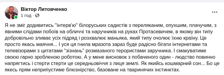 Вот эти руки - это полностью уничтожает всю достоверность всего того, что сейчас извергают в телеэфире, все те слова, которые сейчас заставляют произнести Романа. За это интервью надо вводить против Лукашенко и его банды дополнительные санкции", - написал украинский журналист Юрий Бутусов.