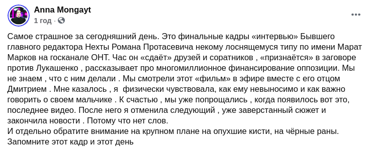 "КГБ не заметило, что запястья Протасевича искалечены тугими наручниками, руки опухшие, и эти страшные руки попали в кадр. Это один из видов пыток, когда руки немеют и теряют чувствительность, и наручники впиваются в руки. Представляю, что они делают в тюрьме с подругой Протасевич Сапегой, чтобы Роман с такими руками так старательно демонстрировал непринужденное общение с приставленным КГБ ведущим.