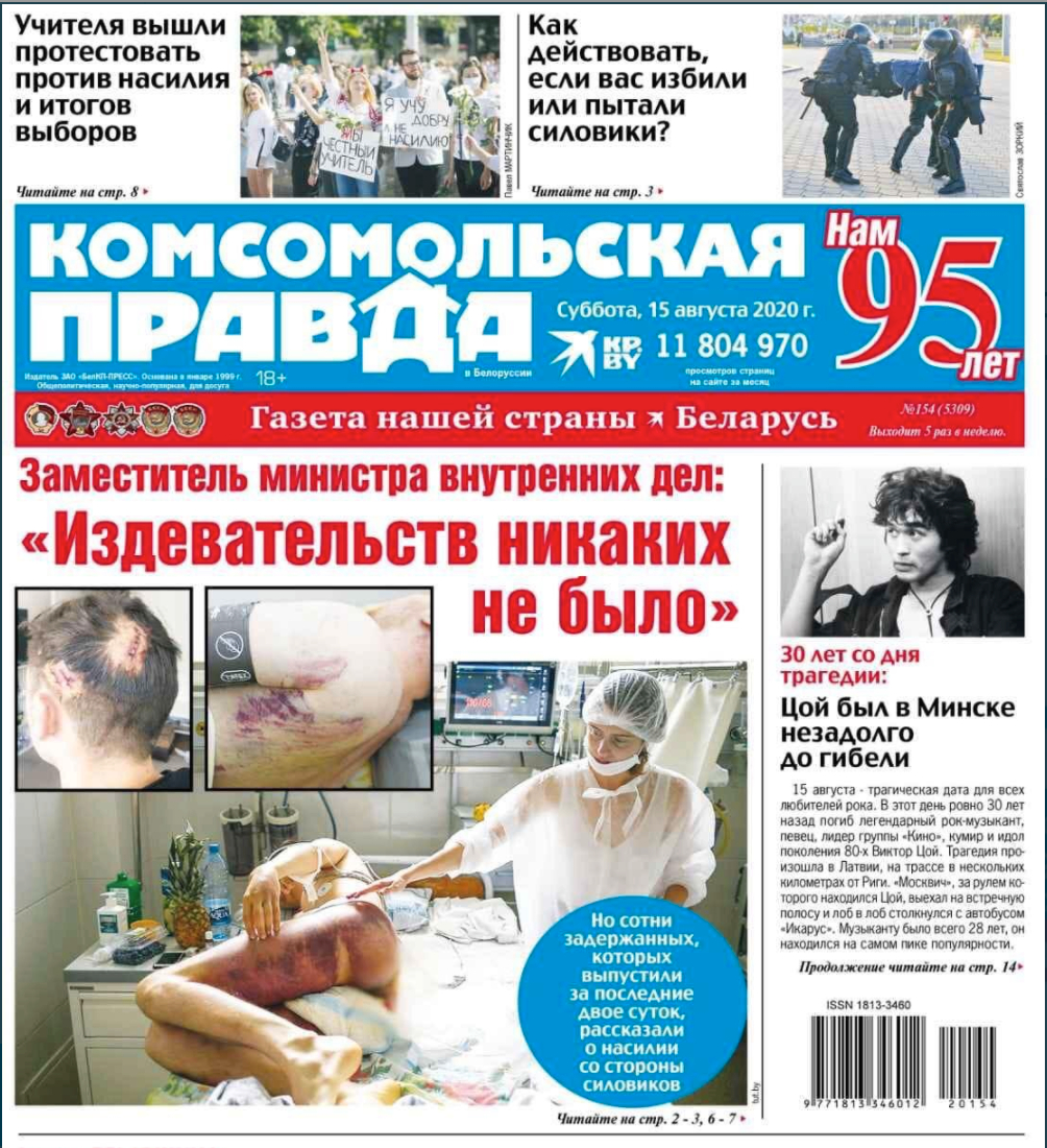 В белорусской "Комсомолке" прямо на обложке опубликовали фото избитых протестующих в Минске после оглашения результатов выбора президента 9 августа.
