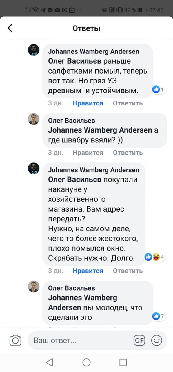 В комментариях к своему посту он написал, что окна были настолько грязными, что простой шваброй и моющим средством не обойтись, "нужно шкрябать".