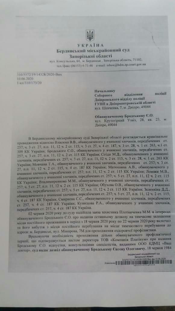 Суд удовлетворил ходатайство адвоката обвиняемого, который аргументировал его тем, что Евгению Бродскому с детьми якобы нужно пройти оздоровление в городе Бердянске. Подозреваемого освободили от домашнего ареста по месту проживания на 5 дней - до 22 июня включительно.