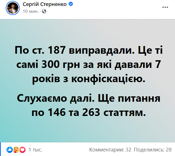 В то же время суд оставляет в силе обвинение по делу о похищении человека. Также Стерненко признали виновным по 263-й статье - незаконное обращение с оружием.