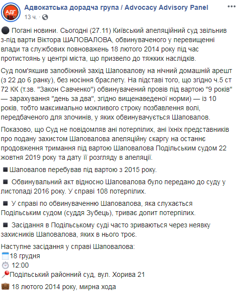 В среду, 27 ноября, Киевский апелляционный суд освободил из под стражи экс-командира роты "Беркута" Виктора Шаповалова, который обвиняется в преступлениях против участников Майдана 2013-2014 годов.