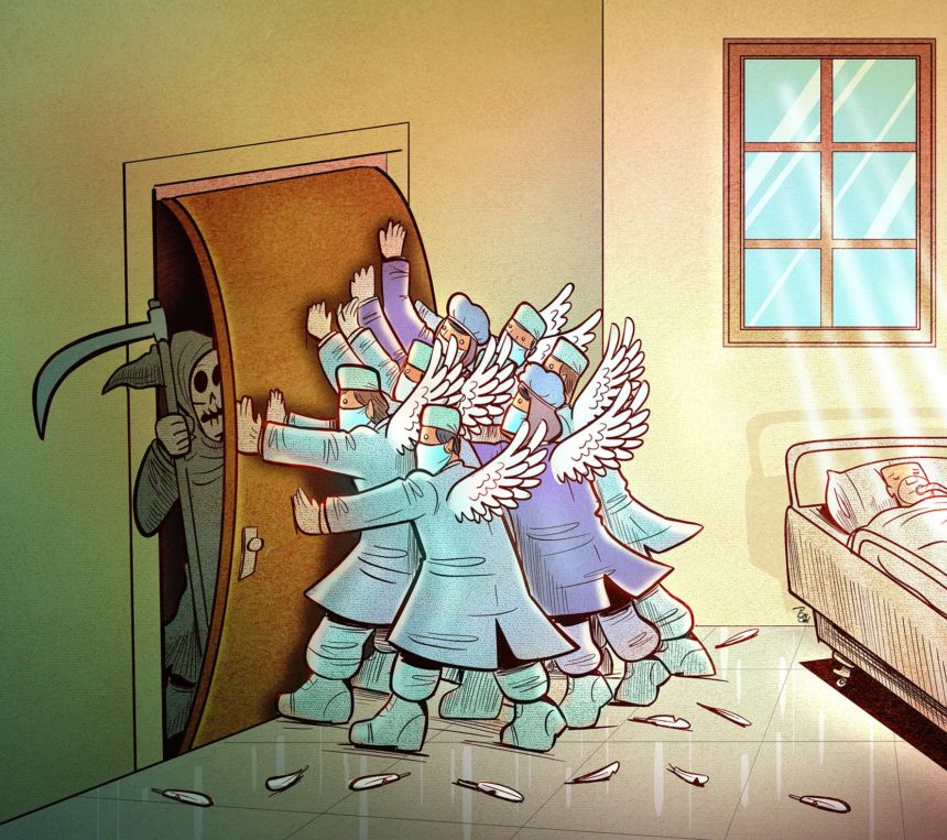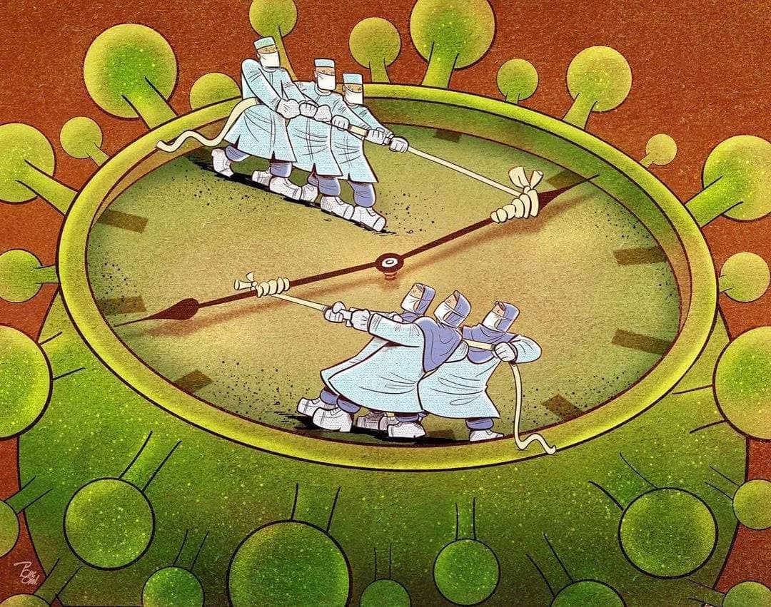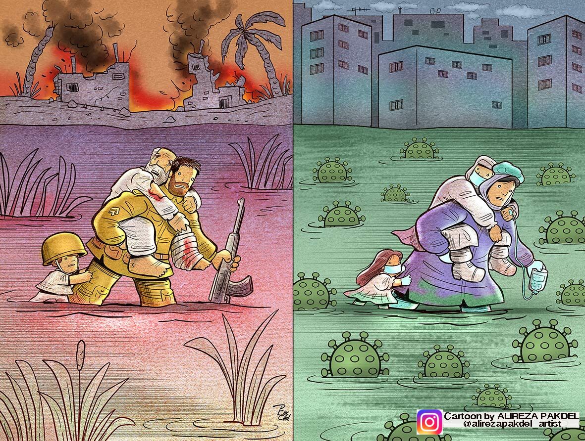 Пандемия COVID-19 унесла множество человеческих жизней во всем мире. Иранский художник Алиреза Пакдел с помощью своих рисунков показал борьбу медиков с опасной болезнью.