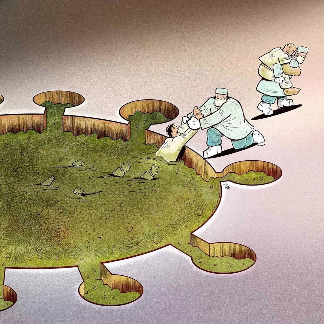 Иранский художник Алиреза Пакдел создает трогательные иллюстрации, которые показывают ситуацию в мире и борьбу медиков с COVID-19.