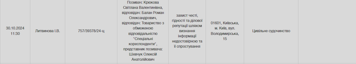 Светлана Крюкова обвиняет Синицына в посягательстве на честь и достоинство. Среди ответчиков также указано ООО "Специальные корреспонденты".