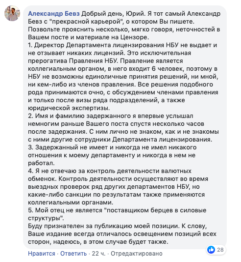 Также Бевз добавил, что не отвечает за контроль деятельности валютных обменок. "Контроль деятельности осуществляют во время выездных проверок ряд других департаментов НБУ, но какие-либо санкции по результатам также применяются коллегиальными органами", - уточнил чиновник.