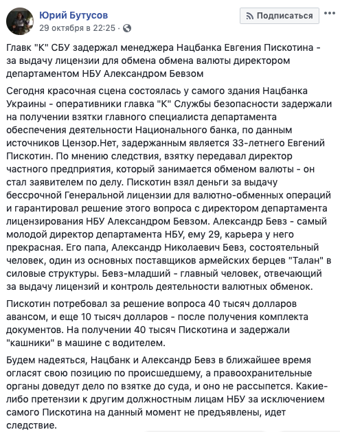 Стоит отметить, что Бутусов также связал задержанного с еще одним работником НБУ - директором департамента лицензирования Александром Бевзом, который, в свою очередь, является сыном генерала и бывшего начальника ГУ МВД в Киевской области.