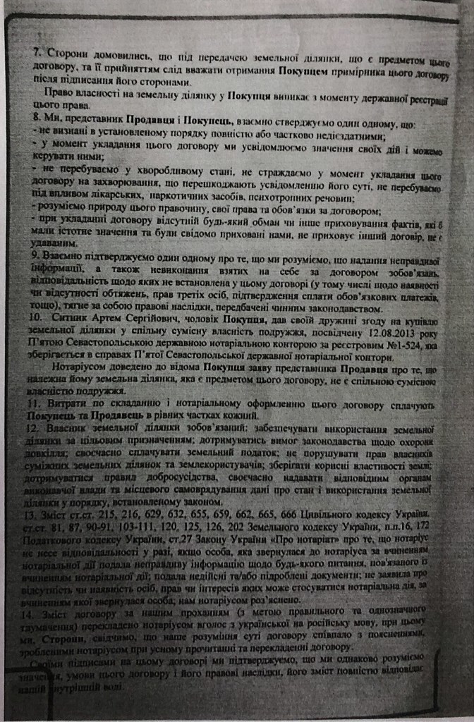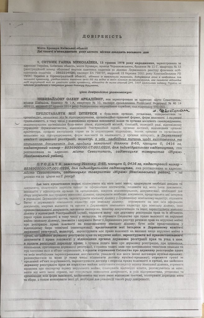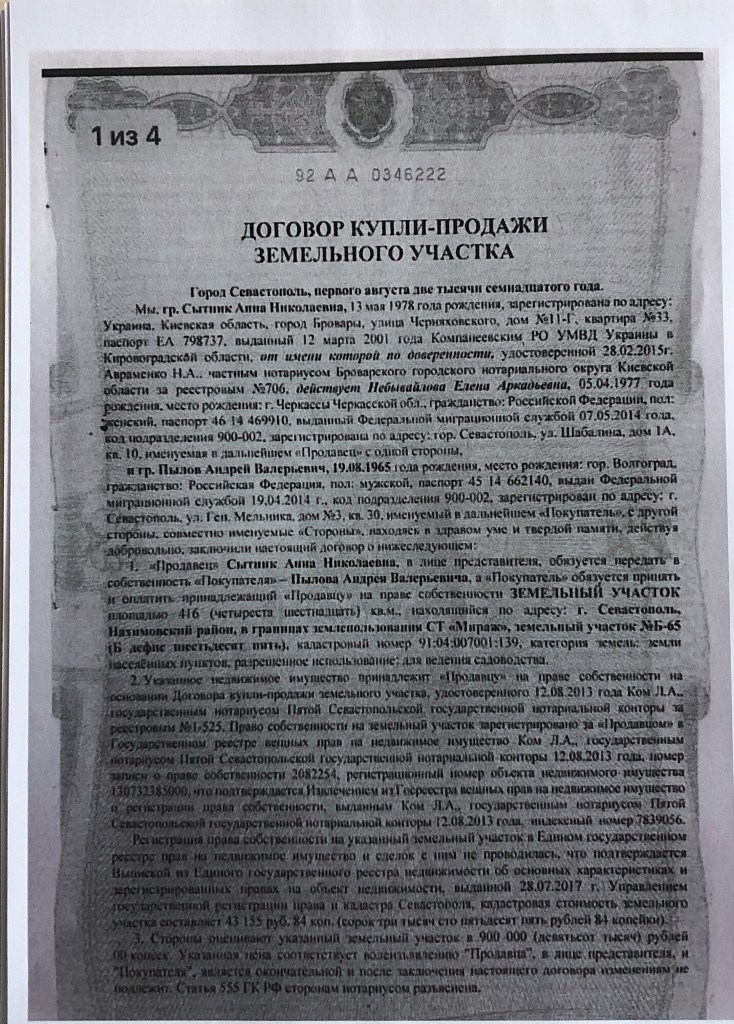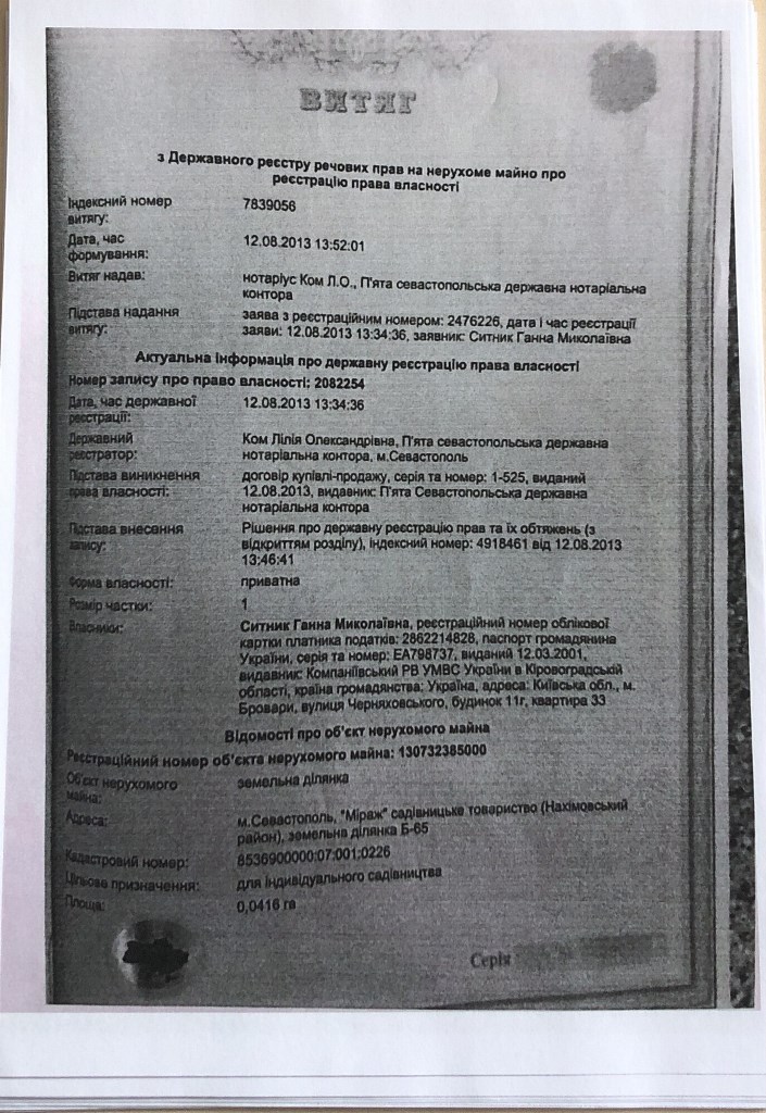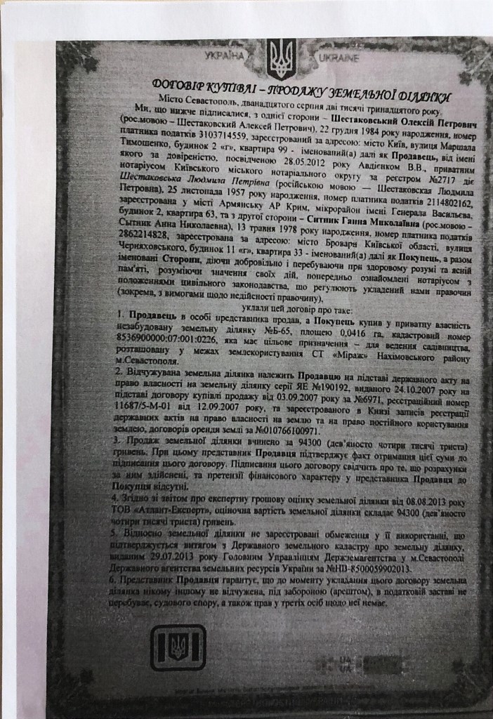 Речь идет об участке Б-65 (кадастровый номер 8536900000: 07: 001: 0226) в садовом обществе "Мираж" в Нахимовском районе Севастополя, который жена Сытника оформила на себя по российскому законодательству (российский кадастровый номер - 91: 04: 007001 : 139), и продала за 900 тыс рублей. В 2015 году Анна Сытник дала доверенность на право отчуждения имущества гражданке РФ Небывайловой. В тот же день Артем Сытник дал жене согласие на отчуждение участка, что подтверждается документами. 1 августа 2017 регистрационными органами оккупационной власти в Севастополе незаконно зарегистрировано право собственности Сытник Анны на участок площадью 0,0416 га в Севастополе. В тот же день Сытники через посредника продали участок за 900 тыс рублей (продавец - Сытник А.Н.), из которых 6600 российских рублей заплатили в российский бюджет в виде пошлины. Фактически же участок был продан еще дороже - за 2 млн рублей, что следует из объявлений о продаже. Ни в декларации жены, ни в декларации Артема Сытника средства от продажи не отражены.