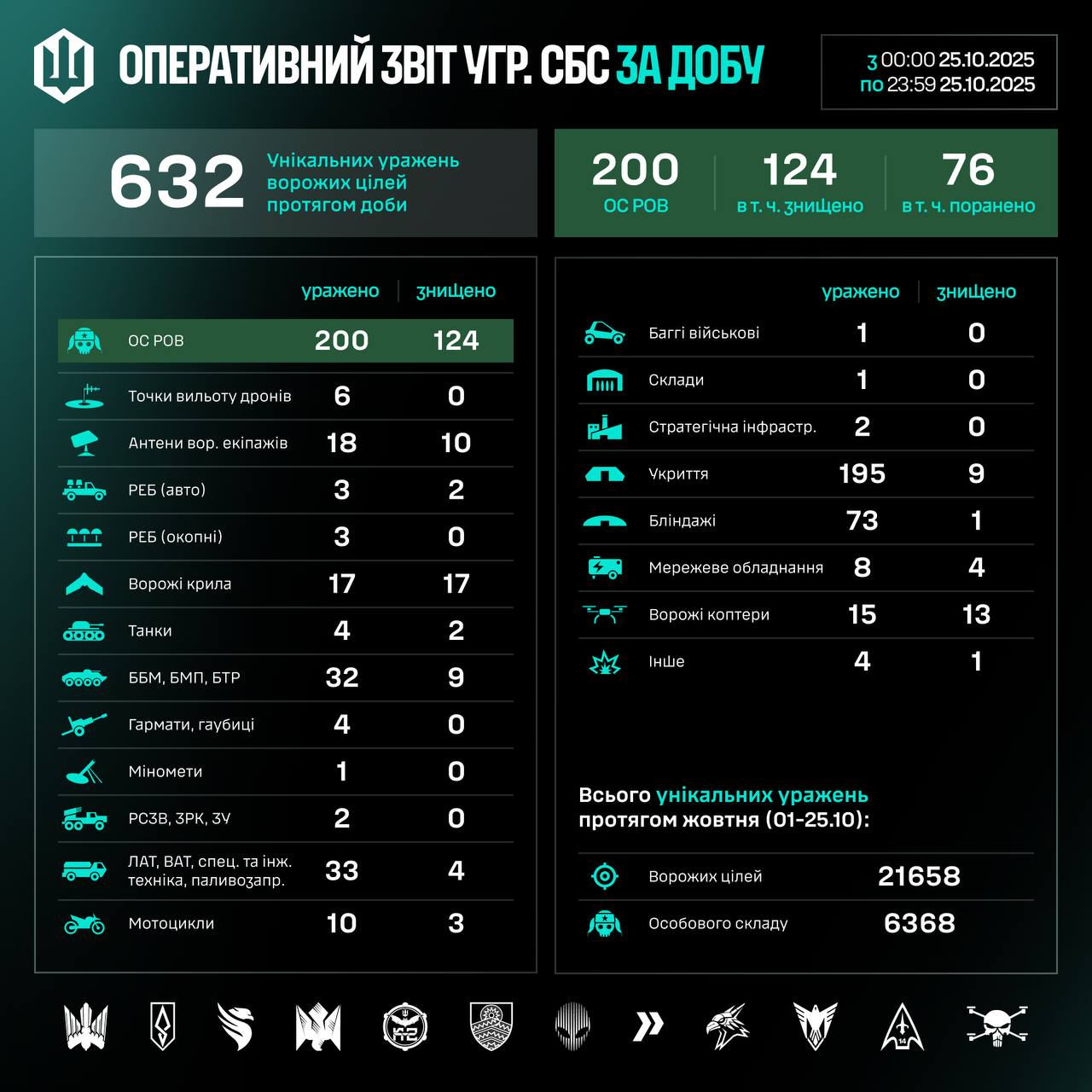 Всего за октябрь (01–25.10) уничтожено/поражено 21658 целей, из них 6368 – личный состав противника.