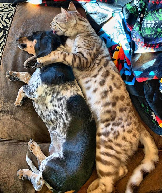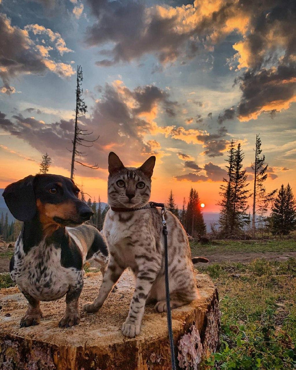 В сети восхищаются удивительной дружбе между собакой породы такса и бенгальским котом, которые живут в штате Колорадо (США).