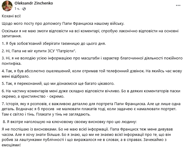 Как писал "Апостроф", ранее историк Александр Зинченко рассказал о покупке дронов для ВСУ за средства ныне покойного Папы Римского Франциска. Эта история оказалась не шуткой.