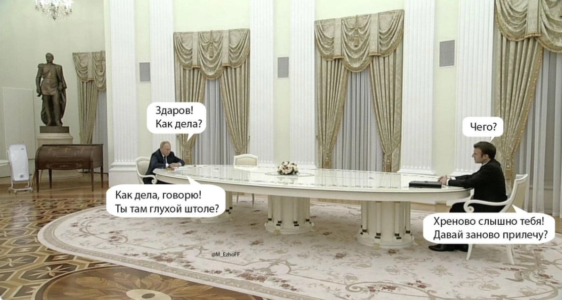 Президенты во время встречи сидели за очень длинным столом, что и стало основанием для множества шуток. Возможно, это было запланировано для соблюдения карантинных требований - дистанции между Макроном и Путином, но пользователи сети решили не думать "официозом" и посмеялись с фото встречи.