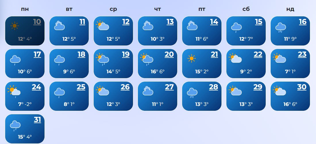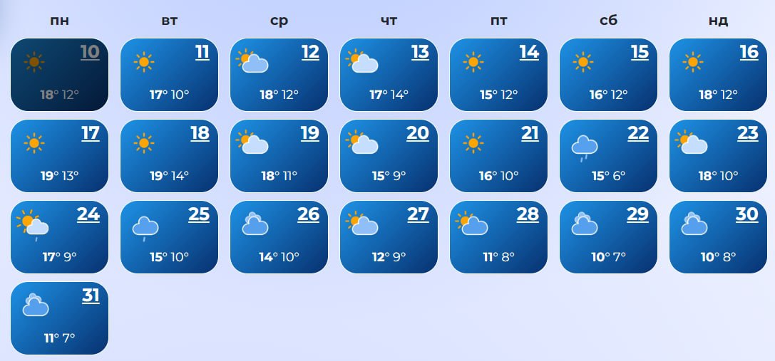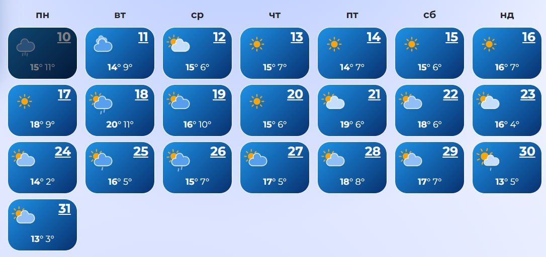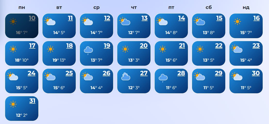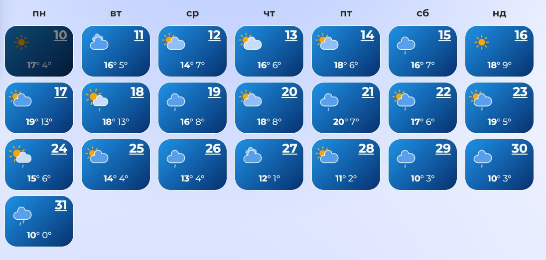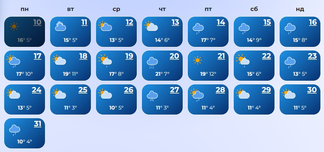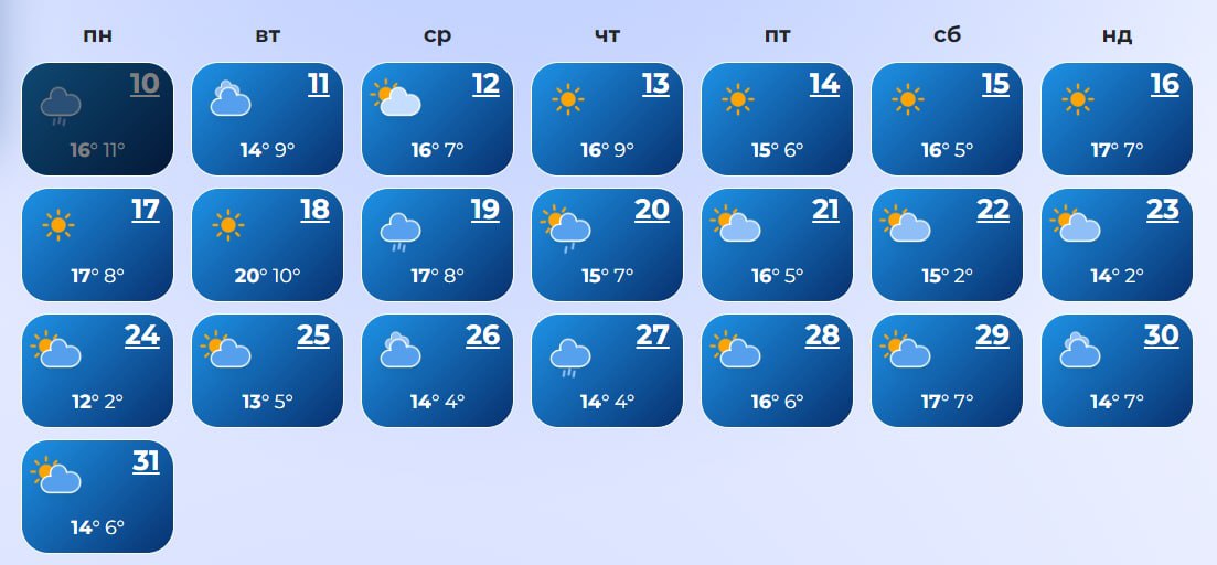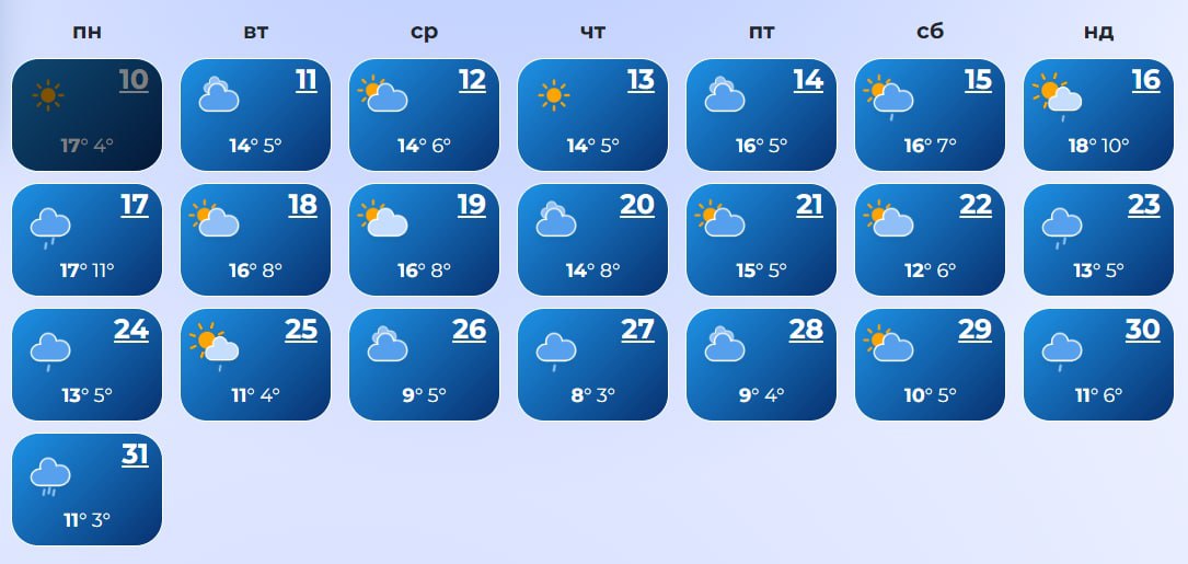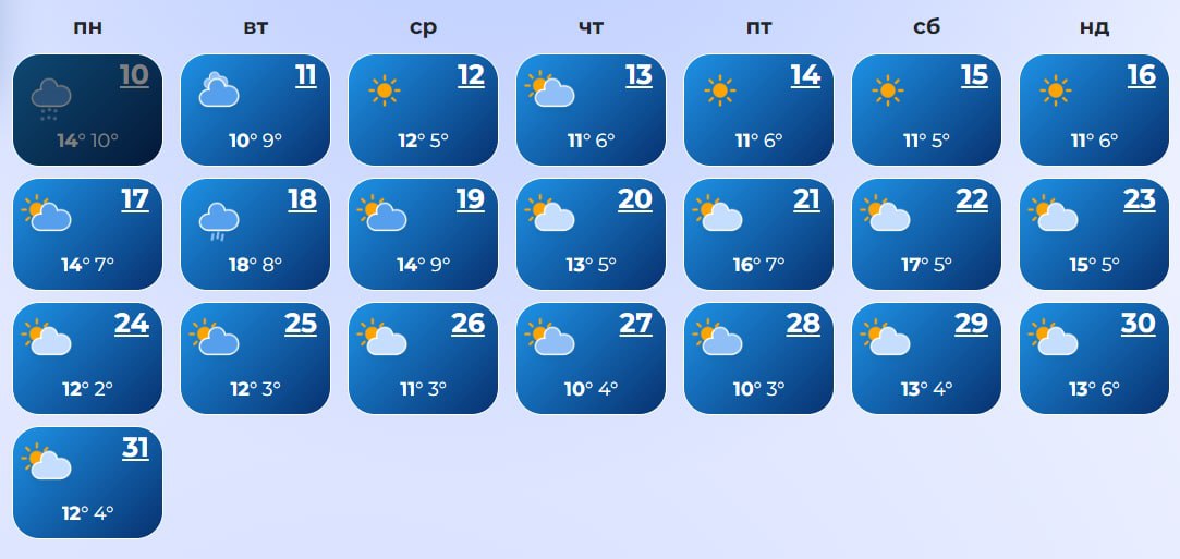 В Ровно с 14 по 17-е число, а также 19, 22, 23, 27-28 и 31 ожидаются дожди. А 20-го даже прогнозируется снег. Температура +10...+21 днем и +3...+12 ночью.