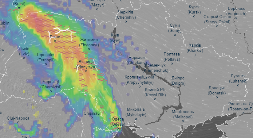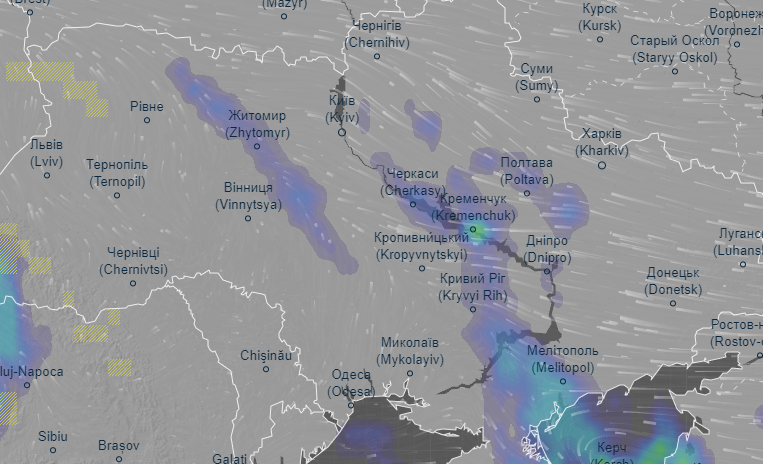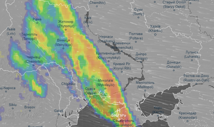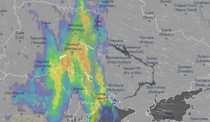 Об этом свидетельствуют данные радара погоды Ventusky.