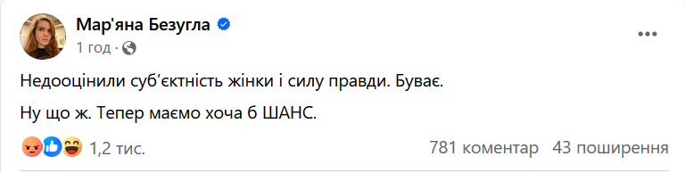 "Недооценили субъектность женщины и силу правды. Бывает. Ну что ж. Теперь есть хотя бы шанс", - написала она.