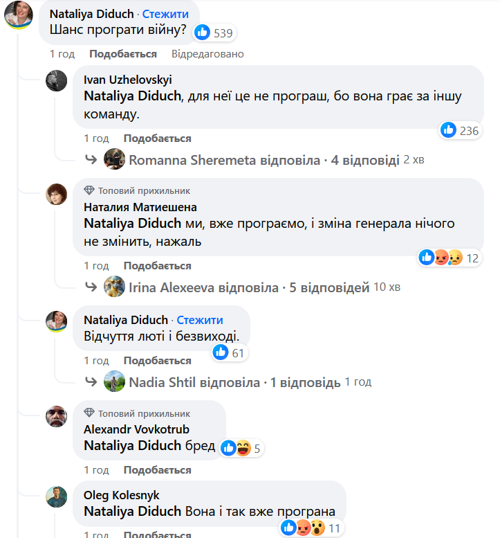 Пользователи соцсети раскритиковали такое сообщение. Некоторые спросили, ведь Безуглая в этот раз не уточнила, имеет ли она в виду "шанс проиграть войну?".