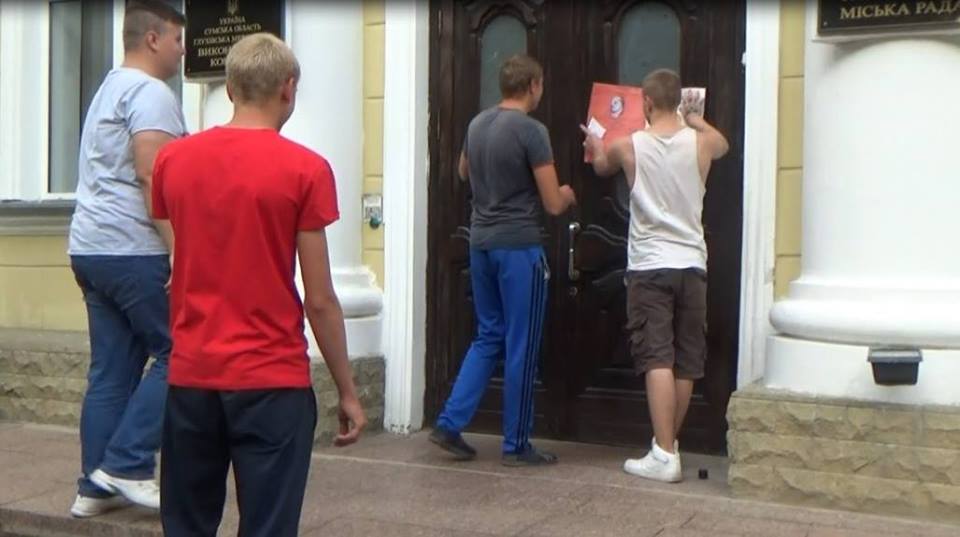 Как видно на видео, студенты прицепили партбилет скотчем к входной двери мэрии.