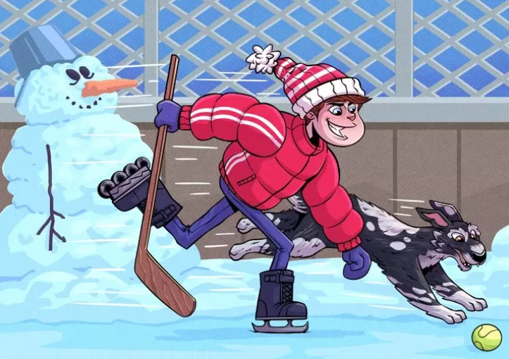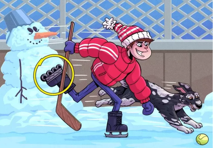 На картинке мы видим мальчика, радостно катающегося на коньках и играющего в хоккей со своей собакой. Однако на этой веселой картинке есть деталь, не совсем вписывающаяся в кадр. Если внимательно взглянуть на картинку, ошибку можно сразу заметить. Если вы решили потренировать свою наблюдательность, то не забывайте, что у вас есть лимит времени в семь секунд.