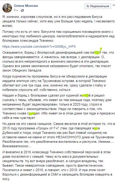 "Оказывается, борец с блогерской дезинформацией сам "врет" так, что фалды заворачиваются. А началось, как всегда, с декларации. По документам он (дом – ред.) вдруг стал числиться административным зданием, а не жилым домом. Что автоматически снизило стоимость аренды вдвое", – пишет Монова.